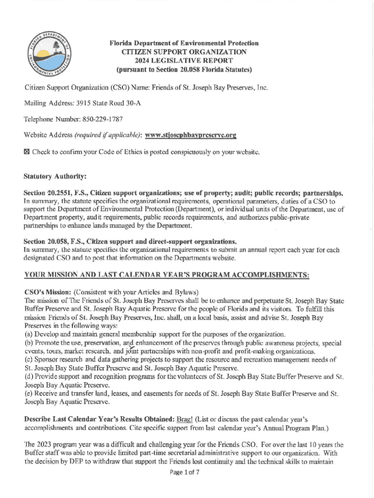 Florida Department of Environmental Protection CITIZEN SUPPORT ORGANIZATION 2024 LEGISLATIVE REPORT (pursuant to Section 20.058 Florida Statutes) Citizen Support Organization (CSO) Name: Friends of