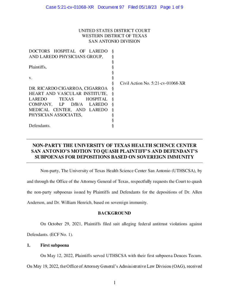 Case 5:21cv01068XR Document 97 Filed 05/18/23 Page 1 of 9UNITED STATES DISTRICT COURT WESTERN DISTRICT OF TEXAS SAN ANTONIO DIVISION DOCTORS HOSPITAL OF LAREDO AND LAREDO PHYSICIANS GROUP, Plaintiffs,