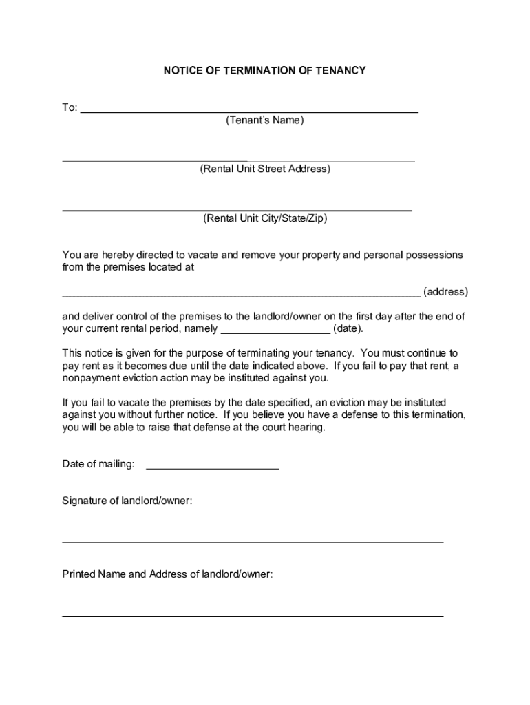 Get the free Notice of Termination of Tenancy