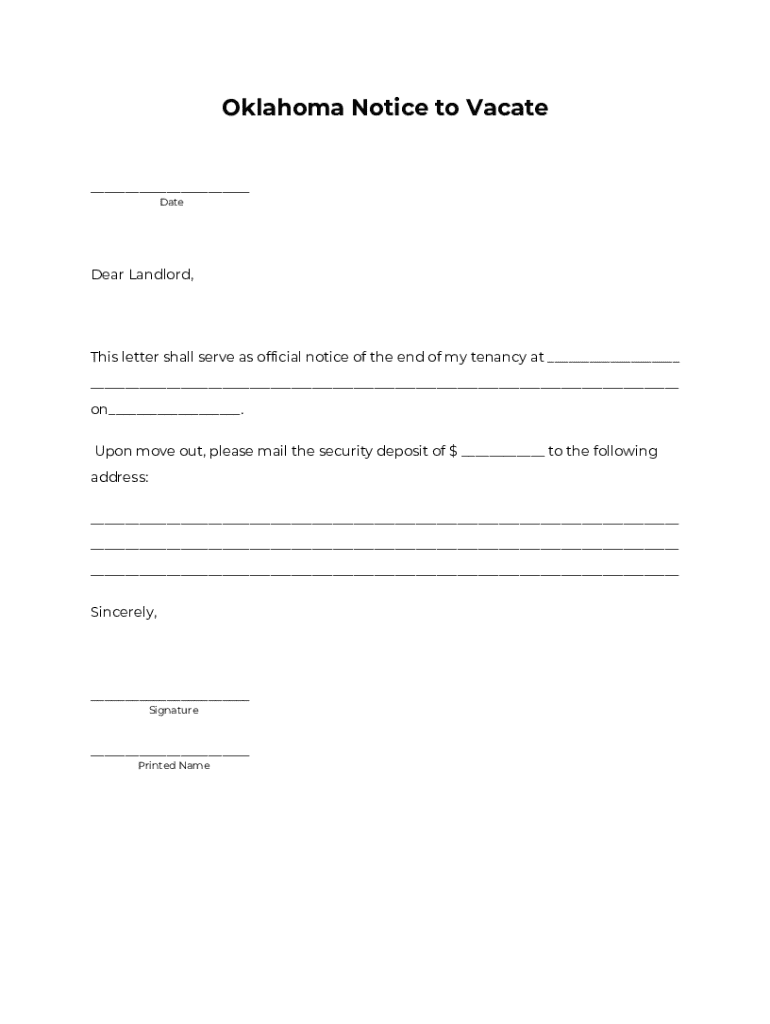 Oklahoma Notice to Vacate ___ DateDear Landlord,This letter shall serve as official notice of the end of my tenancy at ___ ___ on___. Upon move out, please mail the security deposit of $ ___ to the