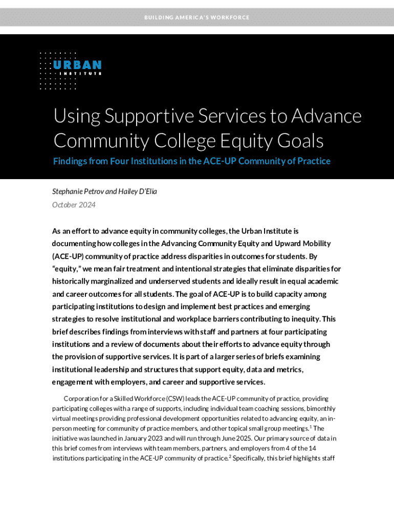 This document outlines the findings from an initiative by the Urban Institute that examines how community colleges within the ACE-UP community of practice are addressing equity and disparities in educational outcomes for historically marginalized and underrepresented students. The study is grounded in interviews and document reviews from four participating institutions, emphasizing the importance of supportive services in achieving equity goals and offering insights on effective practices,...