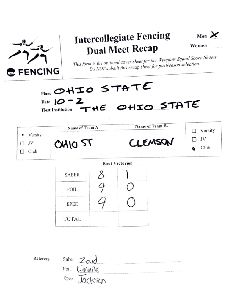 Intercollegiate Fencing Dual Meet RecapMenXVomenThis for m is the optional cover sheet for the Weapons Sq uad Score Sheets. Do NO T subm it this recap sheet for postseason selection.Placeot\':I:0