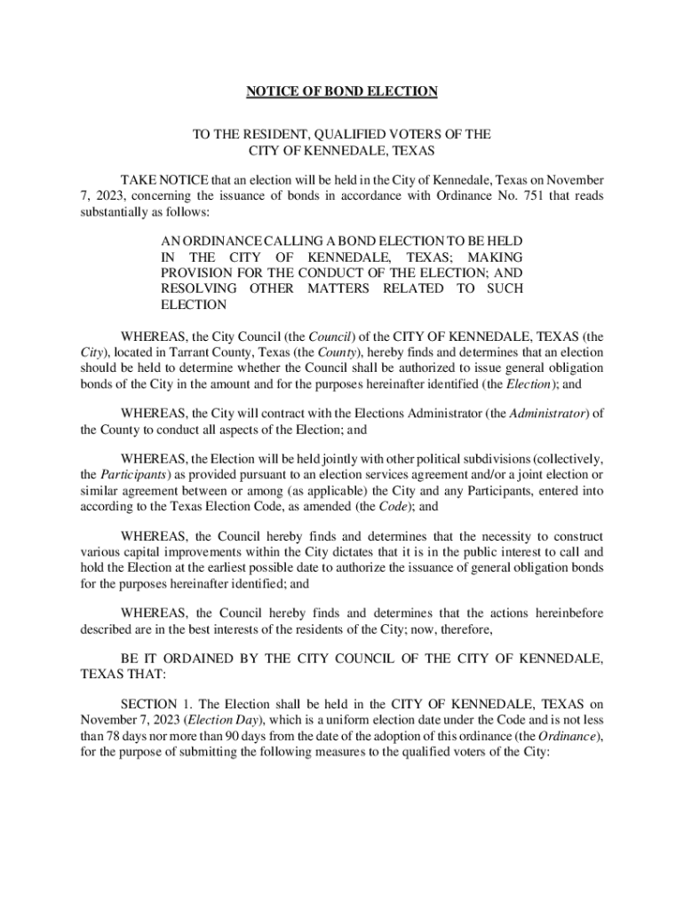 This document serves as a notice regarding the bond election scheduled for November 7, 2023, in the City of Kennedale, Texas, pertaining to the issuance of general obligation bonds for capital improvements, specifically for parks, recreation, and open space enhancements.