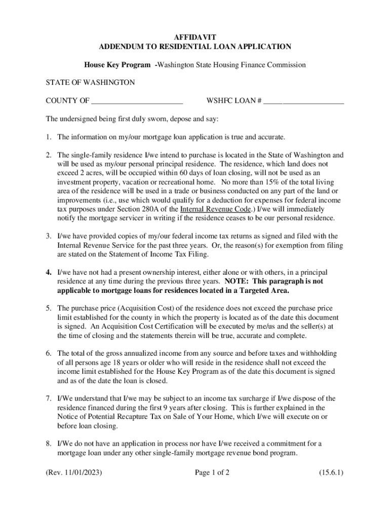 AFFIDAVIT ADDENDUM TO RESIDENTIAL LOAN APPLICATION House Key Program Washington State Housing Finance Commission STATE OF WASHINGTON COUNTY OF ___WSHFC LOAN # ___The undersigned being first duly sworn,