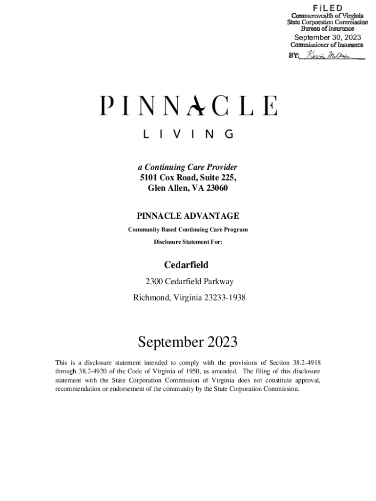 September 30, 2023a Continuing Care Provider 5101 Cox Road, Suite 225, Glen Allen, VA 23060 PINNACLE ADVANTAGE Community Based Continuing Care Program Disclosure Statement For:Cedarfield 2300 Cedarfield