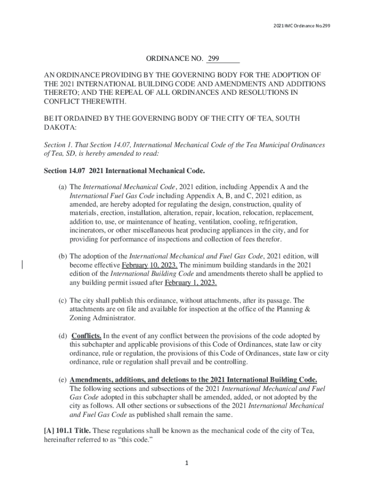 2021 IMC Ordinance No.299ORDINANCE NO. 299 AN ORDINANCE PROVIDING BY THE GOVERNING BODY FOR THE ADOPTION OF THE 2021 INTERNATIONAL BUILDING CODE AND AMENDMENTS AND ADDITIONS THERETO; AND THE REPEAL