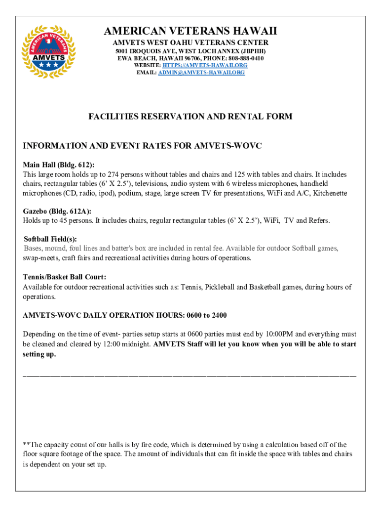 This document provides essential information regarding the facilities available for rent at the AMVETS West Oahu Veterans Center, including details on capacity, rental fees, deposits, terms and conditions, and the required reservation process for events.