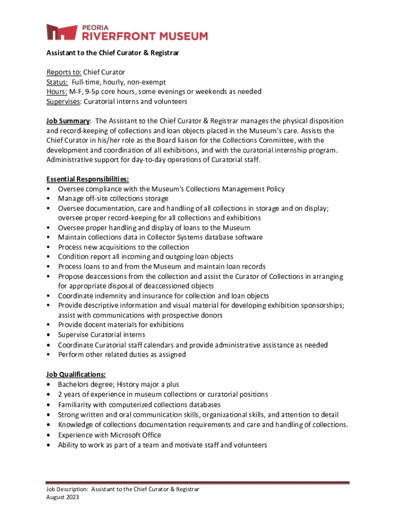 Assistant to the Chief Curator & Registrar Reports to: Chief Curator Status: Fulltime, hourly, nonexempt Hours: MF, 95p core hours, some evenings or weekends as needed Supervises: Curatorial interns