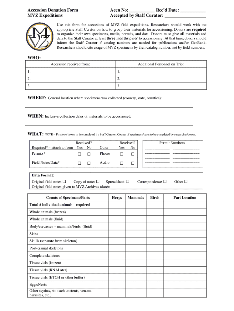Accession Donation Form MVZ ExpeditionsAccn No: ___ Recd Date: ___ Accepted by Staff Curator: ___Use this form for accessions of MVZ field expeditions. Researchers should work with the appropriate