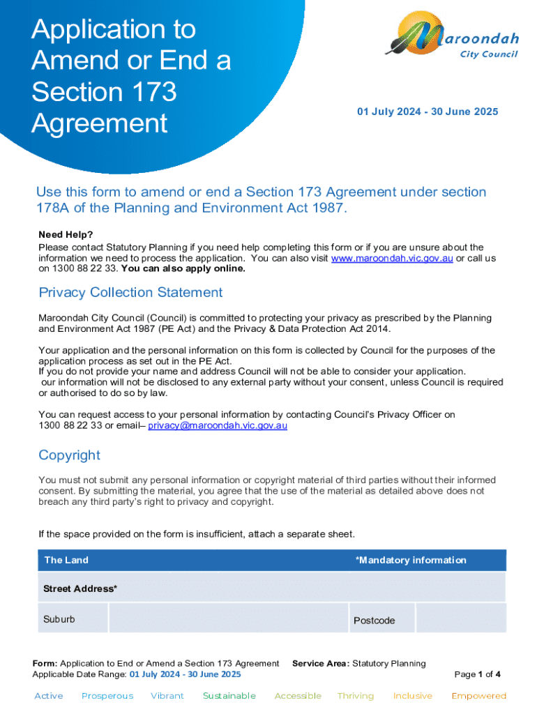 Application to Amend or End a Section 173 Agreement01 July 2024 30 June 2025Use this form to amend or end a Section 173 Agreement under section 178A of the Planning and Environment Act 1987. Need
