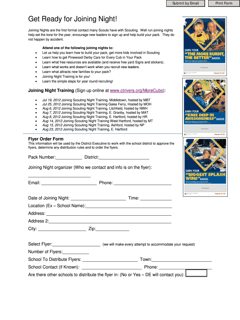 Submit by Email Get Ready for Joining Night! Joining Nights are the first formal contact many Scouts have with Scouting. Well run joining nights help set the tone for the year, encourage new leaders