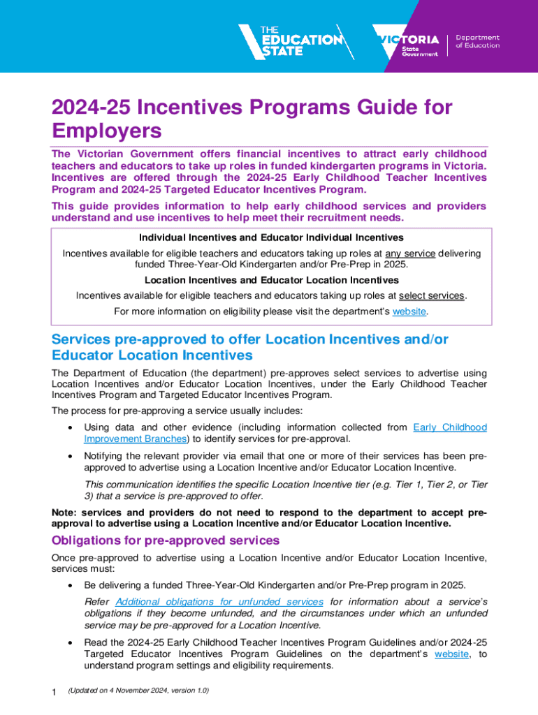 202425 Incentives Programs Guide for Employers The Victorian Government offers financial incentives to attract early childhood teachers and educators to take up roles in funded kindergarten programs