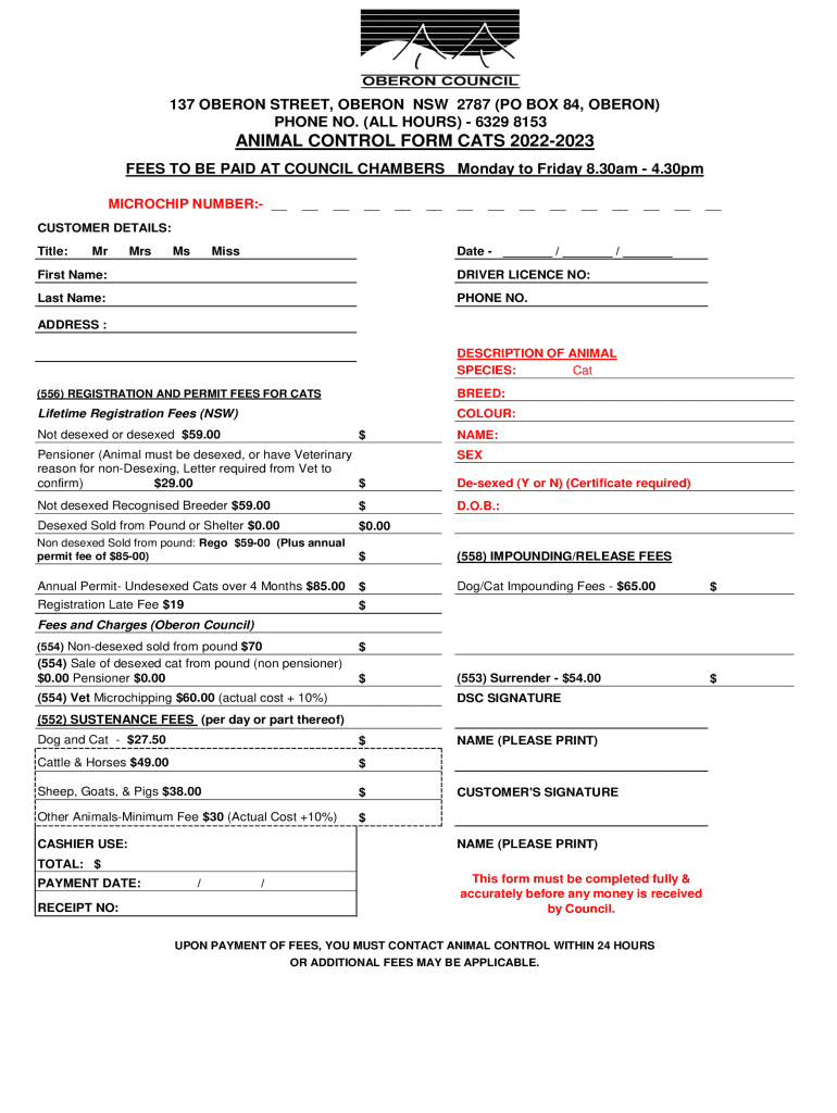This document is an Animal Control Form for registering cats with the Oberon Council for the year 2022-2023. It includes details on registration fees, impounding fees, de-sexing requirements, and other associated costs related to cat ownership in Oberon, NSW.