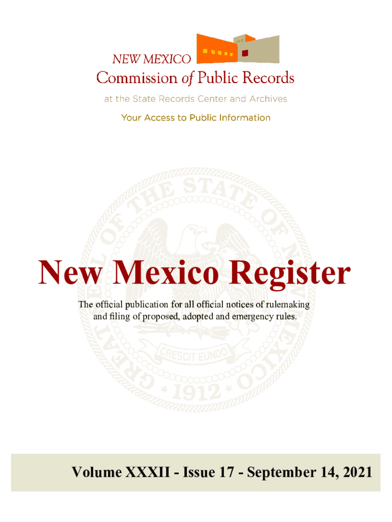 The New Mexico Register is the official publication for all official notices of rulemaking and filing of proposed, adopted and emergency rules, providing details on various administrative law changes, public hearings, and related notices for agencies in New Mexico.