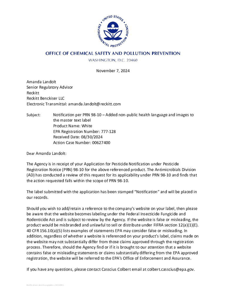 November 7, 2024 Amanda Landolt Senior Regulatory Advisor Reckitt Reckitt Benckiser LLC Electronic Transmittal: amanda.landolt@reckitt.com Subject:Notification per PRN 9810 Added nonpublic health