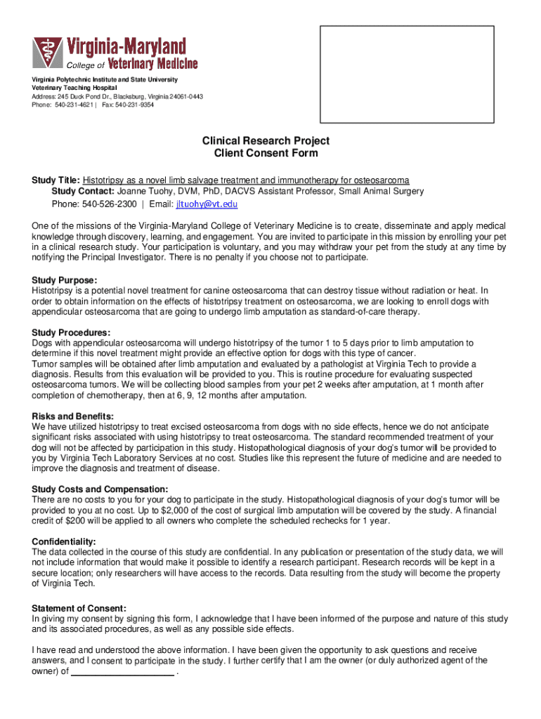 This consent form invites pet owners to participate in a clinical research study evaluating histotripsy as a new treatment for canine osteosarcoma, specifically focusing on dogs with appendicular osteosarcoma who are undergoing limb amputation. The study aims to assess the safety and efficacy of histotripsy in tumor treatment and includes information on procedures, risks, costs, and confidentiality.