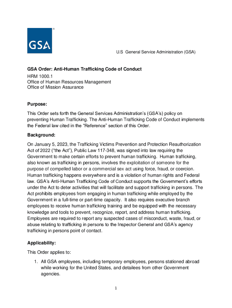 U.S General Service Administration (GSA)GSA Order: AntiHuman Trafficking Code of Conduct HRM 1000.1 Office of Human Resources Management Office of Mission AssurancePurpose: This Order sets forth the