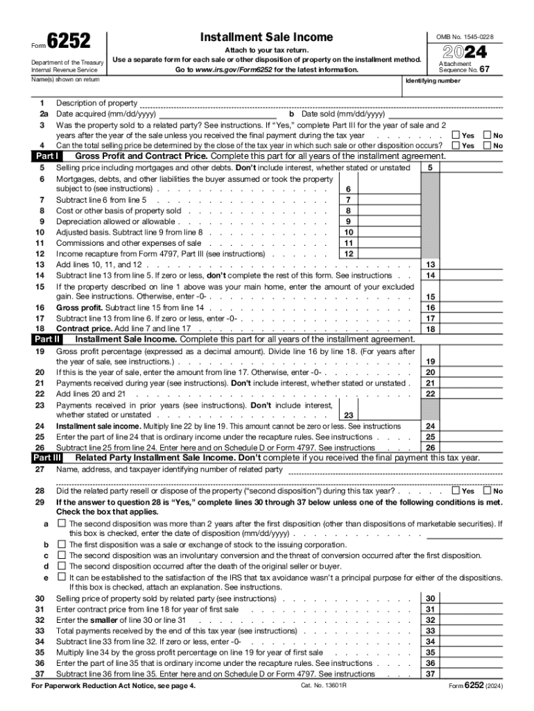 Form6252Department of the Treasury Internal Revenue ServiceInstallment Sale Income47 8 9 10 11 12 13 14 15 16 17 1820 21 22 23 24 25 26Yes YesNo NoGross Profit and Contract Price. Complete this part