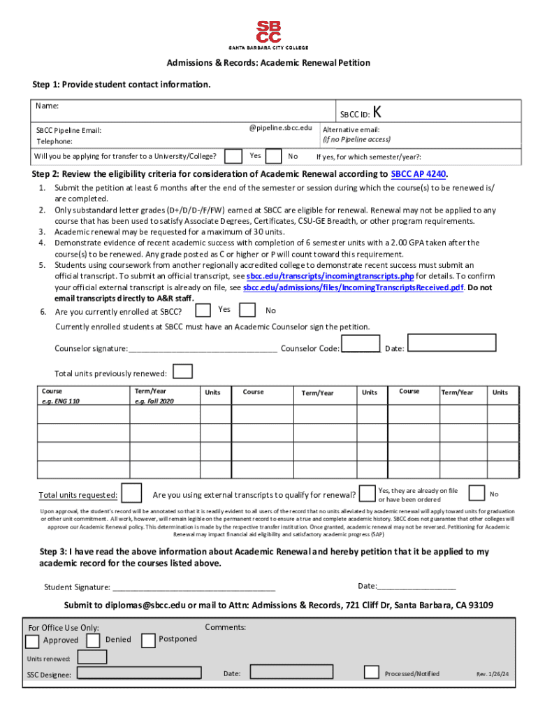 Admissions & Records: Academic Renewal Petition Step 1: Provide student contact information. Name:SBCC ID:SBCC Pipeline Email: Telephone:@pipeline.sbcc.eduWill you be applying for transfer to a University/College?YesNoKAlternative
