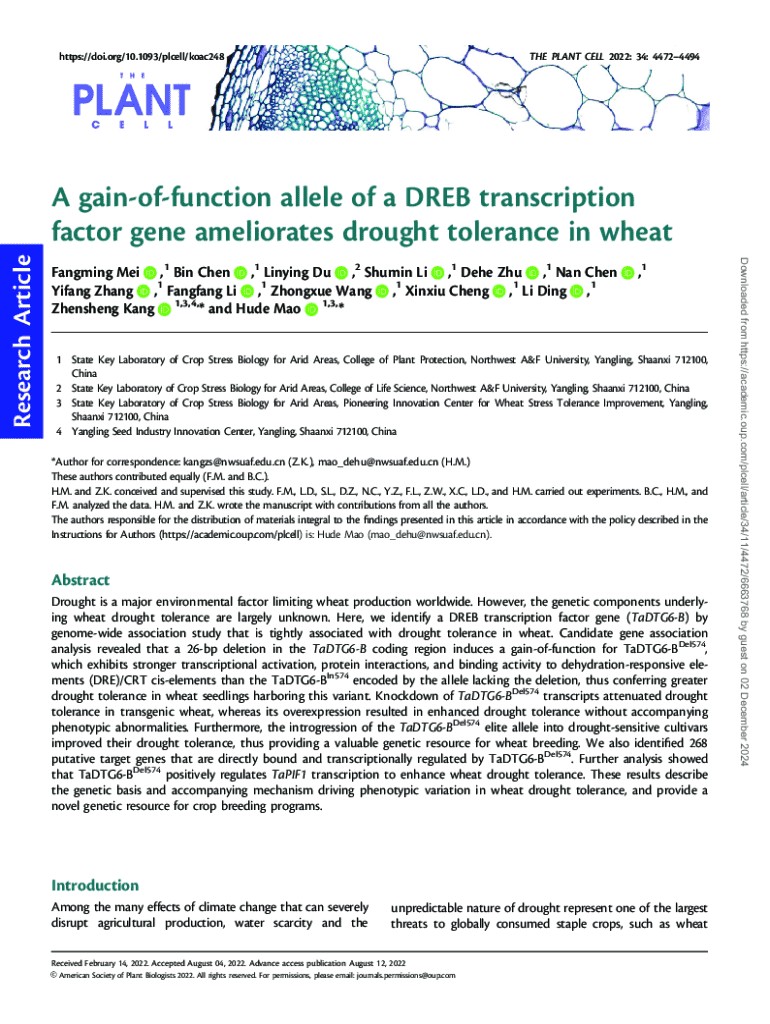 THE PLANT CELL 2022: 34: 44724494https://doi.org/10.1093/plcell/koac248Fangming Mei ,1 Bin Chen ,1 Linying Du ,2 Shumin Li ,1 Dehe Zhu ,1 Nan Chen Yifang Zhang ,1 Fangfang Li ,1 Zhongxue Wang ,1 Xinxiu