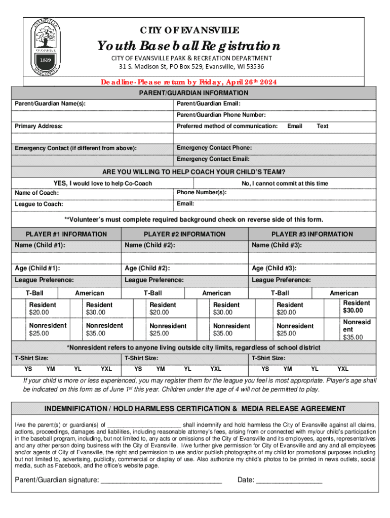 This document is a registration form for the City of Evansville\'s Youth Baseball program, detailing essential information required from parents and guardians, alongside player information and coaching options. The registration includes participant information, league preferences, and consent for participation and background checks.