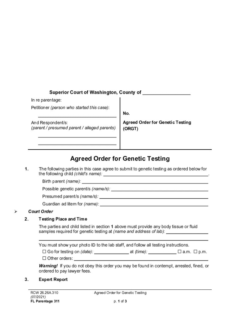 Superior Court of Washington, County of In re parentage: Petitioner (person who started this case): No. And Respondent/s: (parent / presumed parent / alleged parents) Agreed Order for Genetic Testing