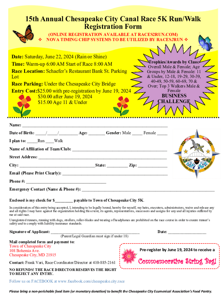 This document is the registration form for the 15th Annual Chesapeake City Canal Race 5K Run/Walk scheduled for June 22, 2024. It includes details about race participation, entry costs, awards, and safety regulations.