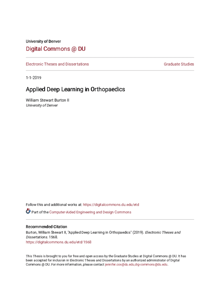 University of DenverDigital Commons @ DU Electronic Theses and DissertationsGraduate Studies112019Applied Deep Learning in Orthopaedics William Stewart Burton II University of DenverFollow this and