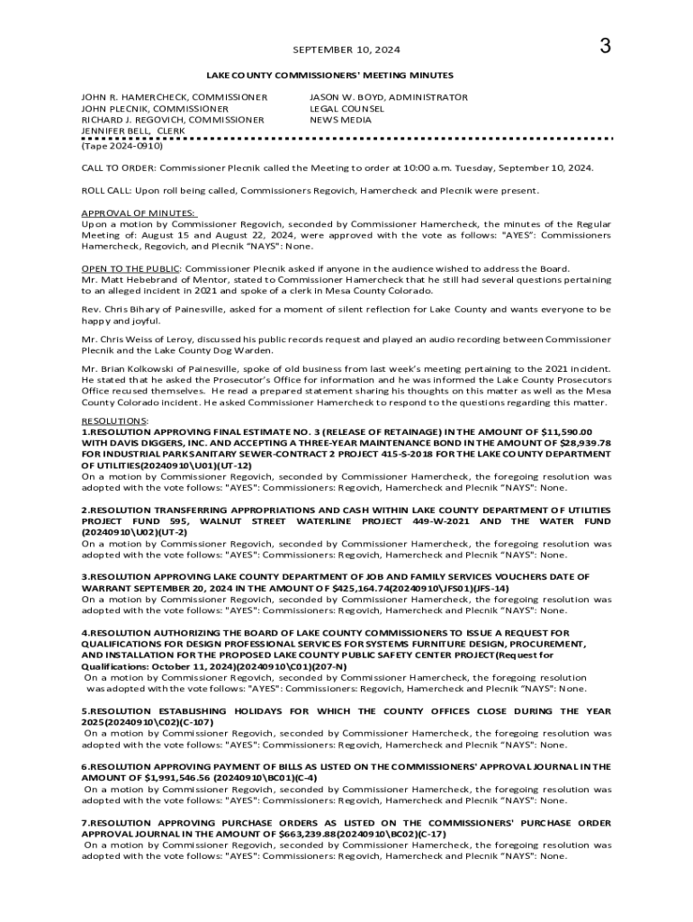 SEPTEMBER 10, 20243LAKE COUNTY COMMISSIONERS\' MEETING MINUTES JOHN R. HAMERCHECK, COMMISSIONER JOHN PLECNIK, COMMISSIONER RICHARD J. REGOVICH, COMMISSIONER JENNIFER BELL, CLERKJASON W. BOYD, ADMINISTRATOR