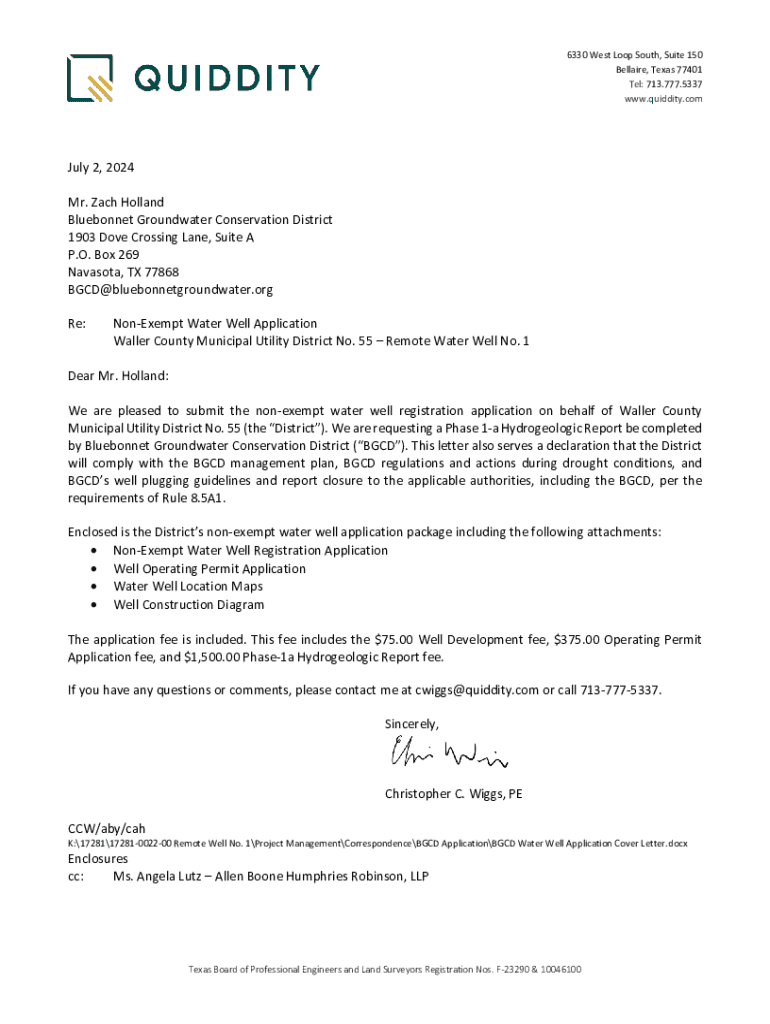 This document serves as an application for registering a non-exempt water well on behalf of Waller County Municipal Utility District No. 55. It includes a request for a Phase 1-a Hydrogeologic Report and confirms compliance with the regulations set by the Bluebonnet Groundwater Conservation District. The accompanying attachments contain relevant application forms, well operational details, and necessary fees for processing the application.