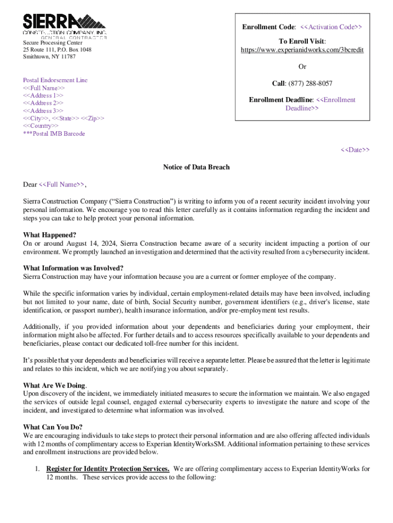 This document is a notice from Sierra Construction Company informing individuals about a recent security incident involving their personal information. It outlines the nature of the incident, what information may have been compromised, steps individuals can take to protect their personal information, and offers complimentary identity protection services.
