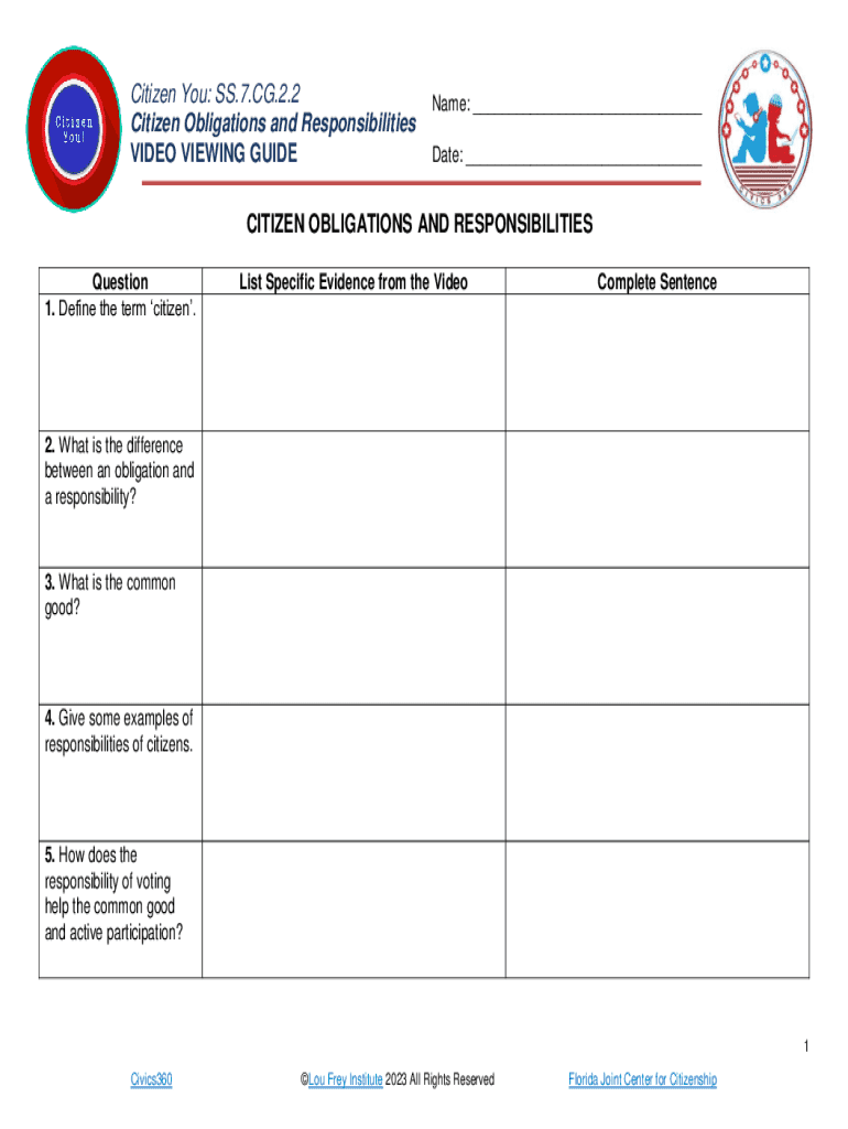 Citizen You: SS.7.CG.2.2 Citizen Obligations and Responsibilities VIDEO VIEWING GUIDEName: ___ Date: ___CITIZEN OBLIGATIONS AND RESPONSIBILITIES Question 1. Define the term citizen.List Specific Evidence