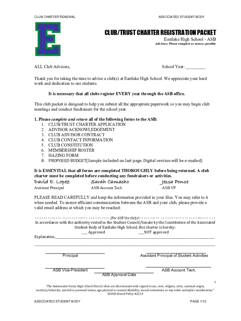 This document serves as a comprehensive guide for clubs at Eastlake High School to register and renew their charters each school year. It outlines the necessary forms, the submission process, legal requirements, and guidelines for conducting activities and fundraisers. The document emphasizes adherence to the rules and regulations stipulated by the Associated Student Body (ASB) and includes forms for advisors and club presidents to complete.