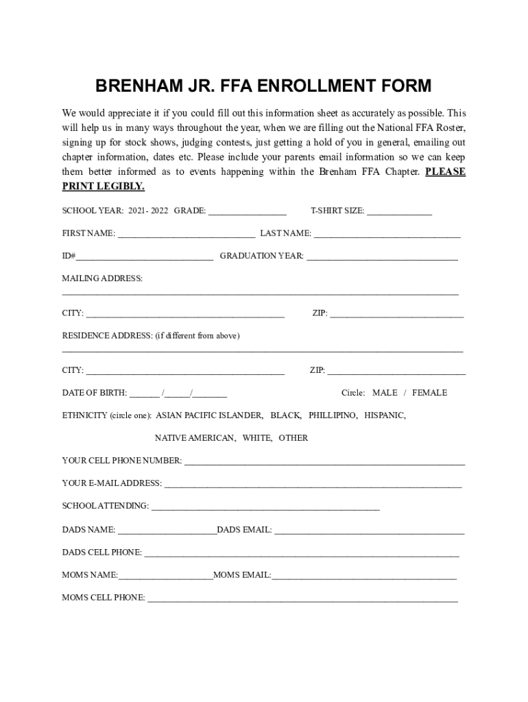 BRENHAM JR. FFA ENROLLMENT FORM We would appreciate it if you could fill out this information sheet as accurately as possible. This will help us in many ways throughout the year, when we are filling