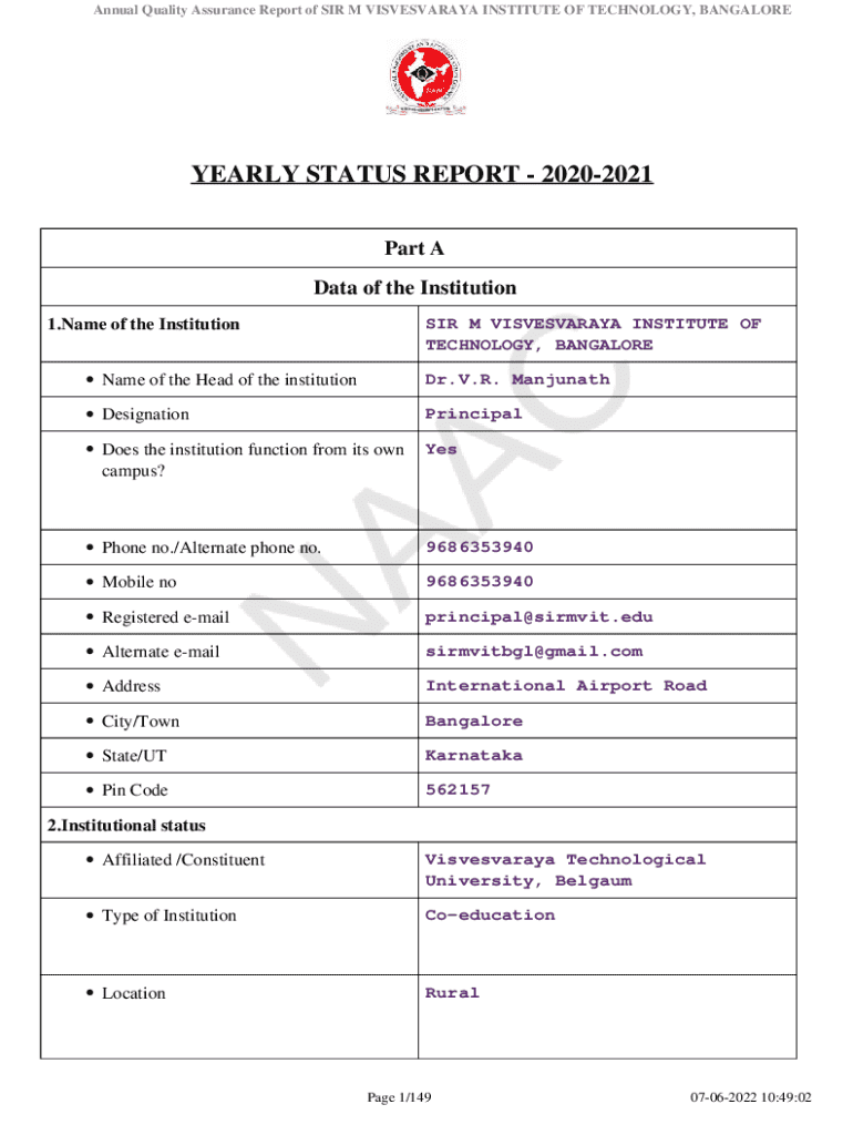 The Annual Quality Assurance Report (AQAR) provides an overview of the academic and administrative performance of SIR M VISVESVARAYA INSTITUTE OF TECHNOLOGY for the academic year 2020-2021, detailing institutional data, initiatives, and outcomes aligned with the quality assessment standards of the NAAC.
