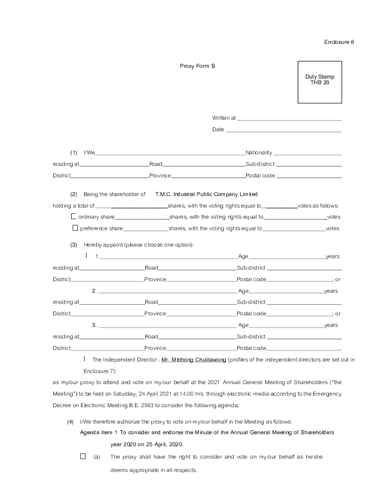 Enclosure 6 Proxy Form B Duty Stamp THB 20Written at Date (1)I/Weresiding at DistrictRoad ProvinceNationality Subdistrict Postal codeBeing the shareholder of T.M.C. Industrial Public Company Limited