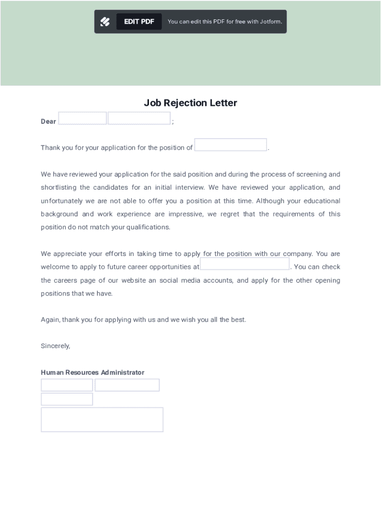 EDIT PDFYou can edit this PDF for free with Jotform.Job Rejection Letter Dear ___;Thank you for your application for the position of ___.We have reviewed your application for the said position and