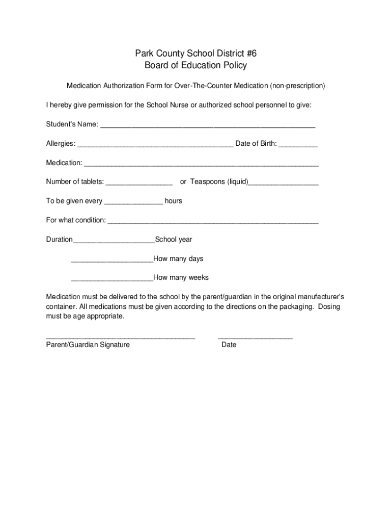 Park County School District #6 Board of Education Policy Medication Authorization Form for OverTheCounter Medication (nonprescription) I hereby give permission for the School Nurse or authorized school