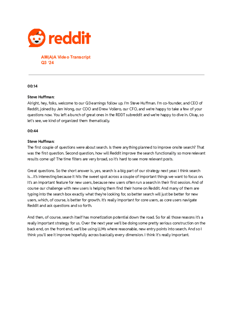 M(A)A Video Transcript A Q3 2400:14 Steve Huffman: lright, hey, folks, welcome to our Q3 earnings follow up. I\'m Steve Huffman. I\'m cofounder, and CEO of A Reddit, joined by Jen Wong, our COO and