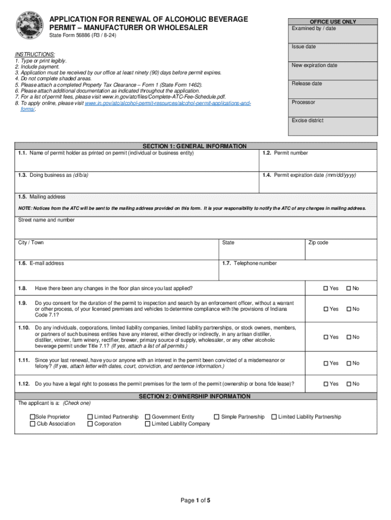 APPLICATION FOR RENEWAL OF ALCOHOLIC BEVERAGE PERMIT MANUFACTURER OR WHOLESALEROFFICE USE ONLY Examined by / dateState Form 56886 (R3 / 824) Issue date INSTRUCTIONS: 1. Type or print legibly. 2. Include