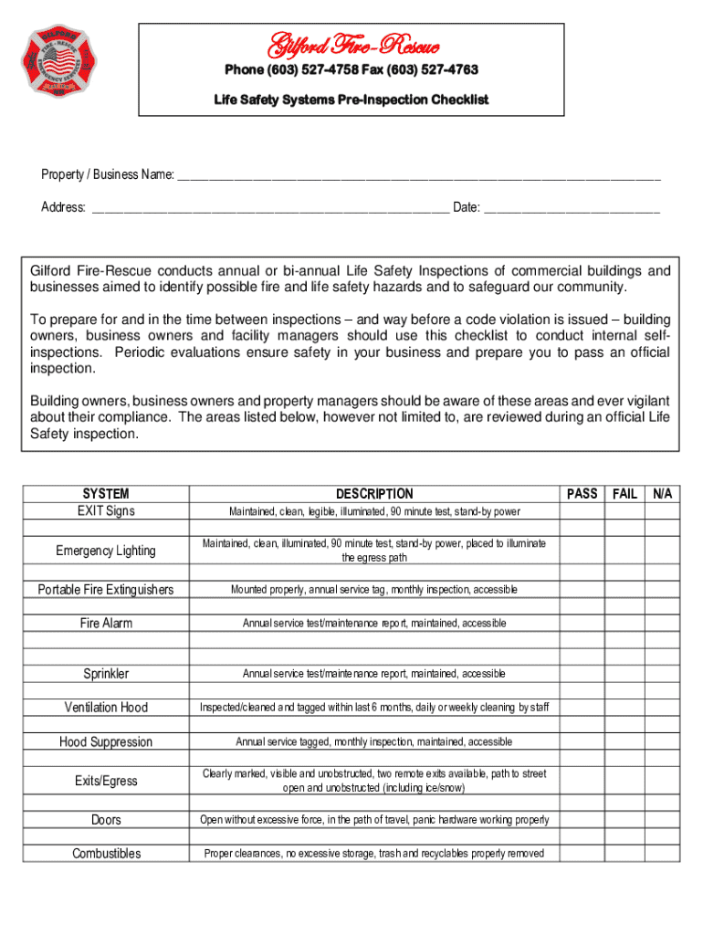 Gilford FireRescue Phone (603) 5274758 Fax (603) 5274763 Life Safety Systems PreInspection ChecklistProperty / Business Name: ___ Address: ___ Date: ___Gilford FireRescue conducts annual or biannual