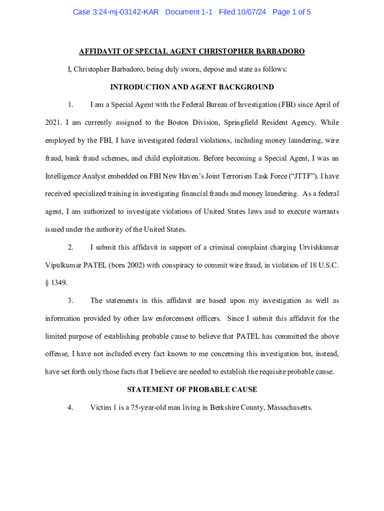 Get the free AFFIDAVIT OF SPECIAL AGENT CHRISTOPHER BARBADORO I ...