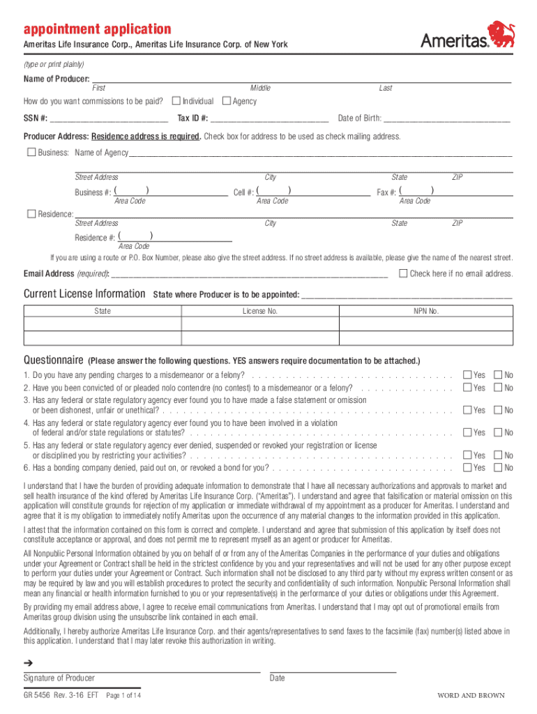 This document is an application form for individuals wishing to become producers for Ameritas Life Insurance Corp. It includes sections for personal information, commission payment preferences, licensing details, a questionnaire regarding legal history, and authorizations for consumer reports. The form ensures compliance with regulations regarding the handling of protected health information.
