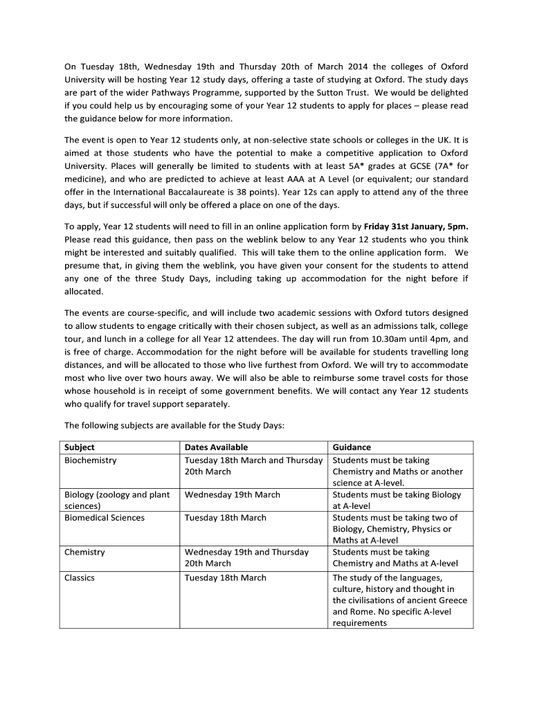On Tuesday 18th, Wednesday 19th and Thursday 20th of March 2014 the colleges of Oxford University will be hosting Year 12 study days, offering a taste of studying at Oxford. The study days are part