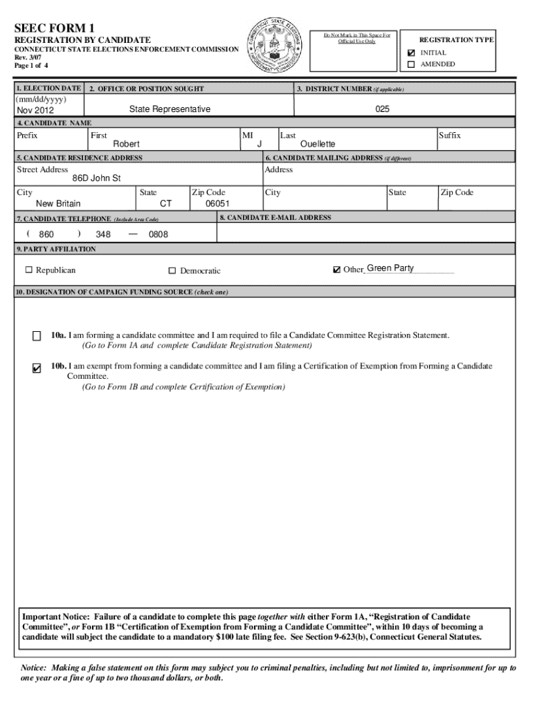 This form is used for candidates in Connecticut to register for elections, detailing candidate information, party affiliation, and funding sources for their campaigns. Failure to complete certain sections within the required timeframe may result in penalties.