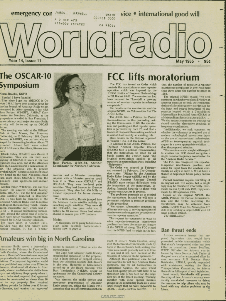 emergency corJAMESMaxwellP 0 30X 473Ross Forbes, WB6GFJ, AMSAT Coordinator for Northern California receiver and a lOmeter transmitter. Anyone with a 10meter receiver could tune it in. Then came OSCAR7