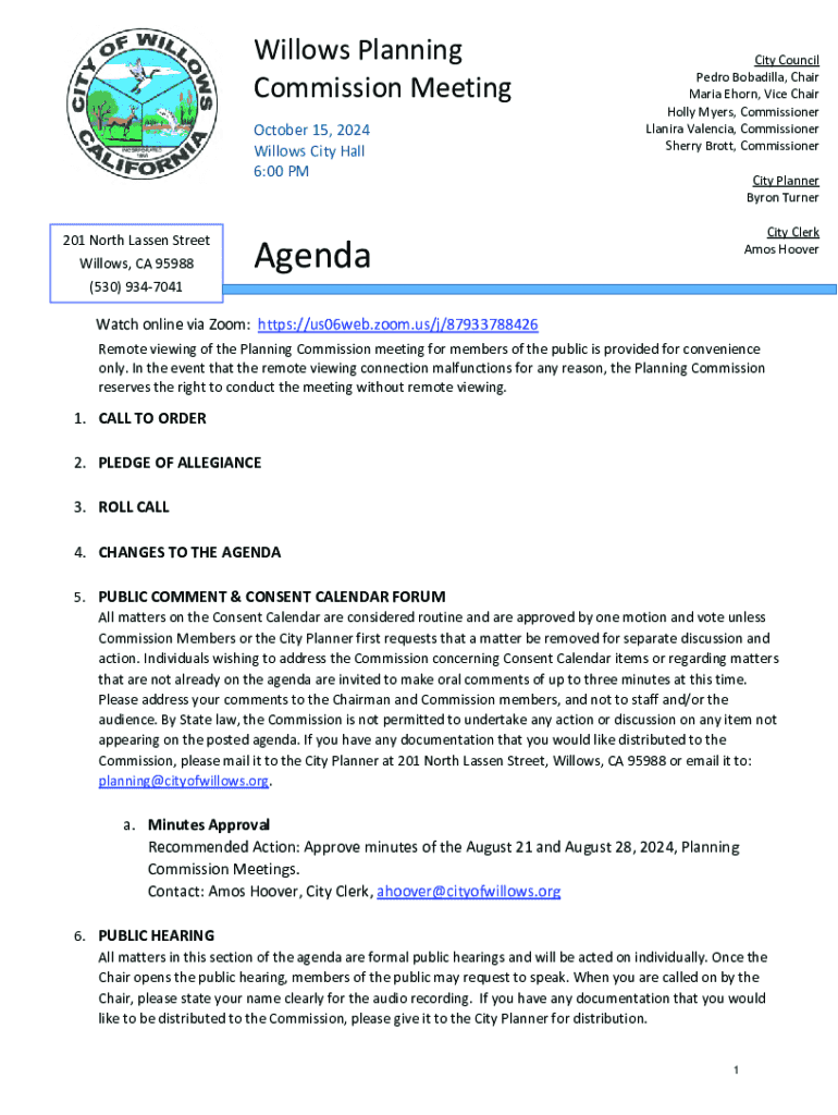 Willows Planning Commission Meeting October 15, 2024 Willows City Hall 6:00 PM201 North Lassen Street Willows, CA 95988 (530) 9347041City Council Pedro Bobadilla, Chair Maria Ehorn, Vice Chair Holly