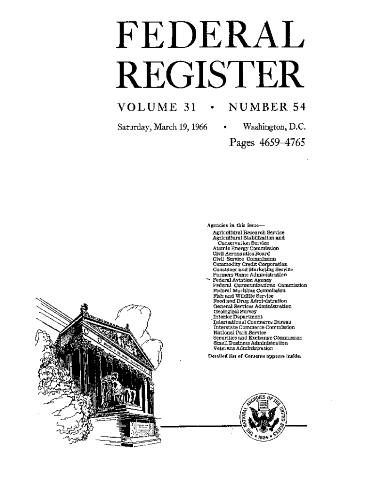 FEDERAL REGISTER VOLUME 31 Saturday, March 19, 1966NUMBER 54 Washington, D.C.Pages 46594765Agencies in this issueAgricultural Research Service Agricultural Stabilization and Conservation Service Atomic
