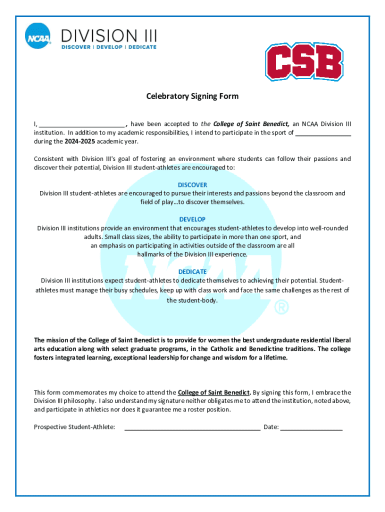 This form is a formal acknowledgment by the prospective student-athlete of their acceptance to the College of Saint Benedict, an NCAA Division III institution. It emphasizes the commitment to academic and athletic participation while outlining the principles of discovery, development, and dedication inherent to the Division III philosophy.