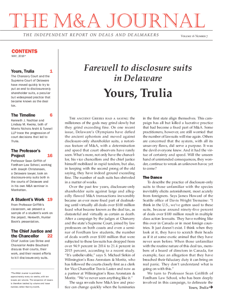 The M&A Journal The independent report on deals and dealmakersVolume 16 Number 7contents MAY, 2016*Yours, Trulia1The Chancery Court and the Supreme Court of Delaware have moved quickly to try to put